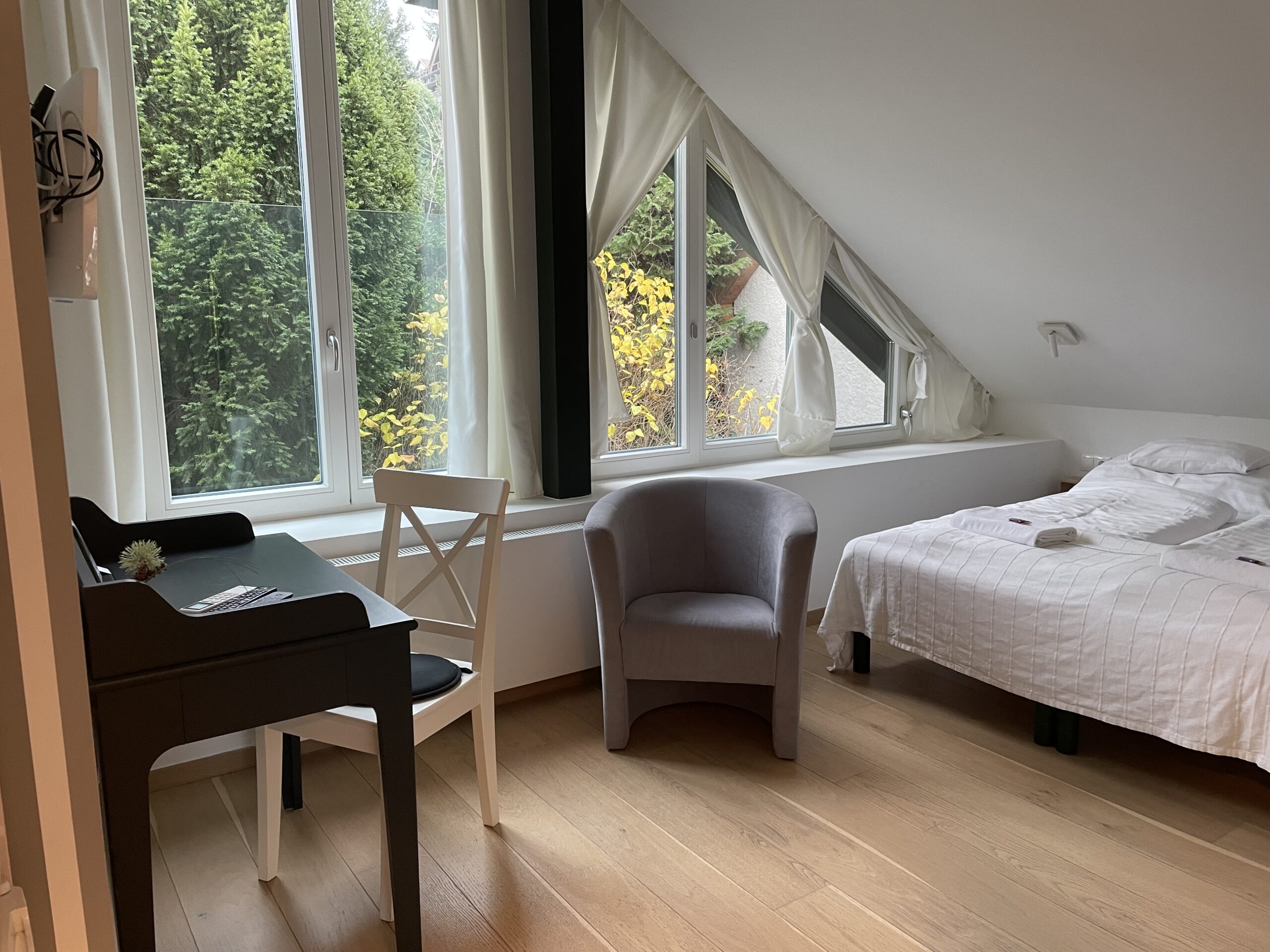 Szoba franciaággyal, kertre néző, TV, légkondicionáló, minihűtő, széf, 16 m2, fürdőszoba, íróasztal, WiFi/streaming szolgáltatások (Netflix, Amazon, stb.)